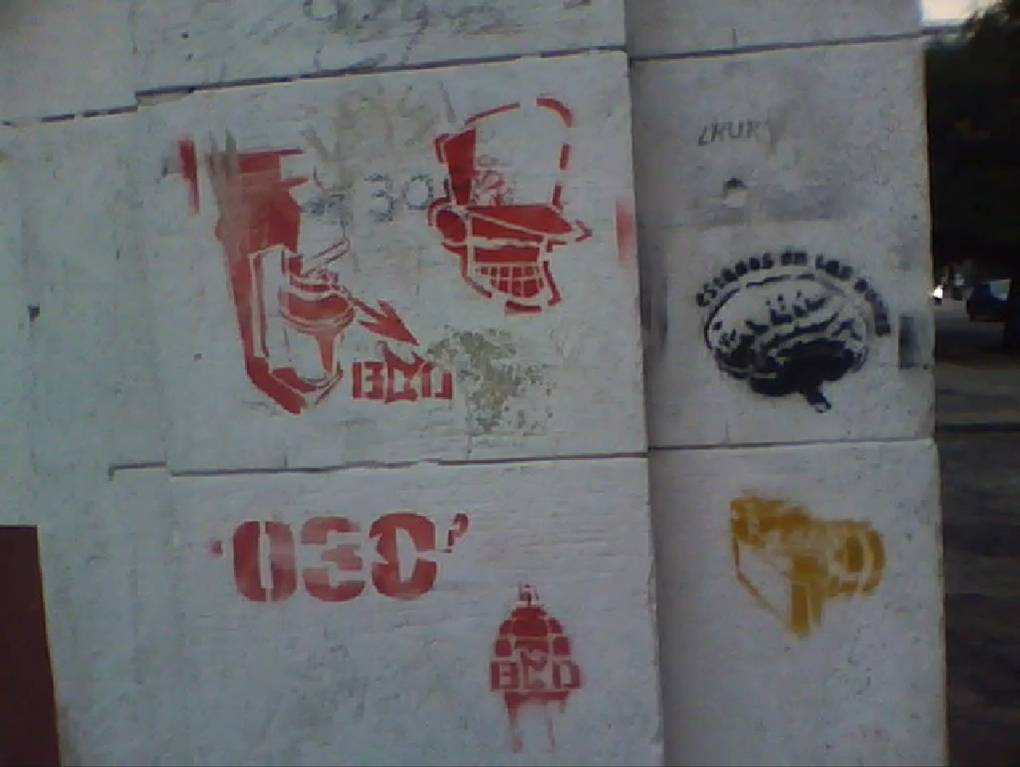 Within stenciled graffiti there stand out the numerous ones that, along with military helmets and grenades, exhibit the initials “BCD,” which stands for “Bajo condiciones dificiles” (Under difficult conditions).  Most people believe is a reference to poor living conditions here on the island.