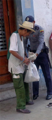 Nearby, a police officer was dragging away an old beggar by the arm. The officer angrily picked up four dusty newspapers the guy had been trying to sell. Almost tearing them, he stuffed them in a plastic grocery bag.