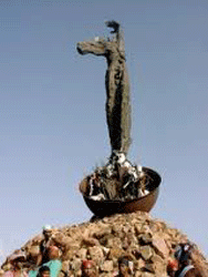 The town of El Cobre showcases two great cultural figures. The beautiful and lavish shrine of the “Virgen de la Caridad,” and this not too distant undefined figure that one will remember for its outstretched arm or its weapon of combat. It is a tribute to blacks who suffered the cruel and degrading condition of slavery.