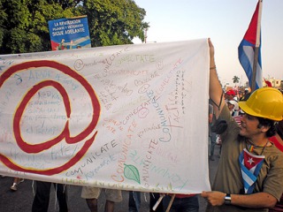 One of the posters displayed a large “@” symbol, alluding to the need for digital connection to articulate the struggles for greater freedom and to communicate the messages of diverse movements committed to addressing the social problems in Cuba and around the planet. Another representative banner specified “Socialism is Democracy – Dump the Bureaucracy!”