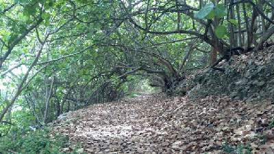 The trail goes up the mountain a bit, opening up into a broad leaf strewn path. It took another 30 minutes or so of hiking, frequently interrupted by tranquil views of the sea, to reach the campsites.