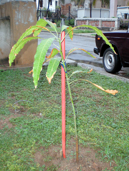 After a good downpour I was at the corner of 13th and M Street, where I stopped in front of a small mango tree.   Planted in a flower bed, the sapling had damaged leaves and was held up thanks only to a conspicuous red stake.  This cleaning and care, which had been done with such care, caught my admiration.  Who could this person be who was struggling like this for the survival of a mango tree?