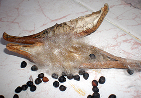 This is why when a Ceiba has blossomed and produced fruits and seeds, it can be detected from far away. When the time comes, it looks as if it had snowed all around because the “cotton” of the seeds covers everything. Inside that “wool” are seeds that are tiny, round, dark brown and hard.