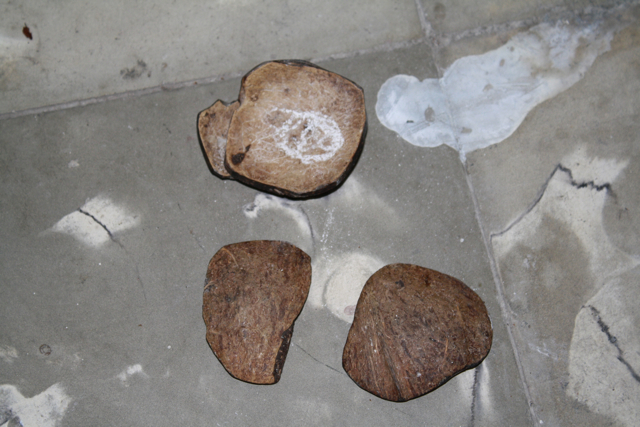 When the ritual ended, we walked inside and returned to the attic.  Iyalocha Lourdes performed a small purification ritual in front of a white, round table filled with offerings and then cast coconut shells – also known as obi divination – to see if any further work was needed.  Two of the shells landed with the dark skin up and the other two with the white, pulpy skin landed on top of each other (it appeared the coconut meat was gone and the shells had been marked with a white crayon).  Iyalocha Lourdes informed me that this was a very good sign.  “If they had landed the other way, with the two dark-skinned shells on top of each other, I would have had to sacrifice a chicken,” she said.  I sighed with relief.