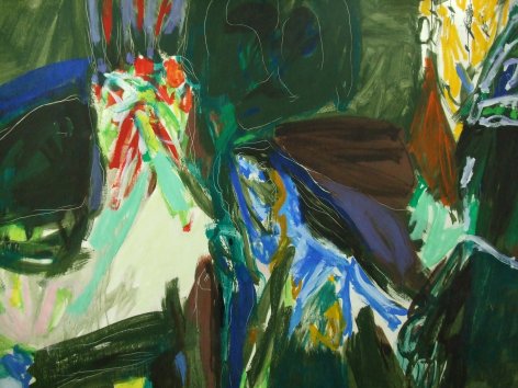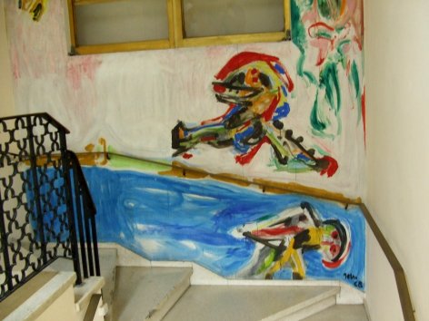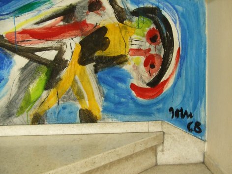 The murals painted by Jorn stand out for their use of strident colors – yellows, blues and greens.  Many people believe they recognize specific moments in the revolutionary struggle within some of these paintings, though there’s nothing figurative in these works.