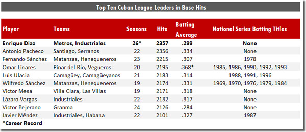 The new challenger on the horizon will most likely be Yulieski Gourriel (1248 hits over 10 seasons entering the current campaign), but Gourriel still has considerable ground to cover. He trails the new mark by nearly 1100 and will therefore have to maintain his current 120 hits/year pace for another full decade in order to overhaul Enrique.