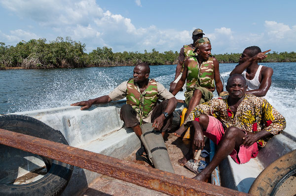 Our local guide and sailors from the Sierra Leone Navy discussing the way ahead.