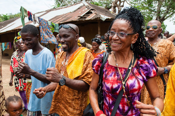 The culmination of the trip was a week’s stay in the ancient village of Mokpangumba. Accompanied by Mama Lucy, the Cubans walked towards the village (which has no motor road access) to the sound of drumbeats and singing. No less than four masked devils from the secret societies and virtually the entire village had turned out to celebrate their arrival.