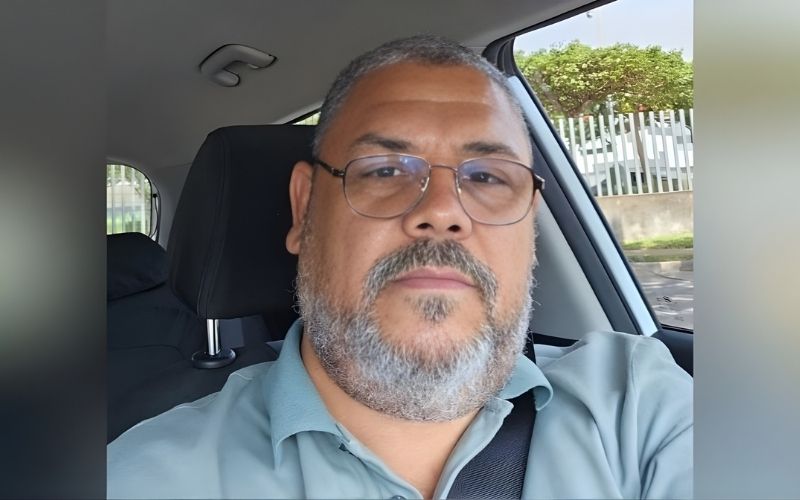 He is 40 and Jessica Palacios’ husband. Police beat him during his arrest and accused him of holding political meetings during the May 2025 raid. (His photo and part of his surroundings were reconstructed with AI.)