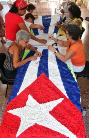At five meters in length and one meter wide, the banner presents a Cuban flag covered with embroidered flowers, a sun with a man and a woman in its center, with everything surrounded by a garden. Each workshop took responsibility for crafting some part of the work, which was stitched into a whole in East Alamar.