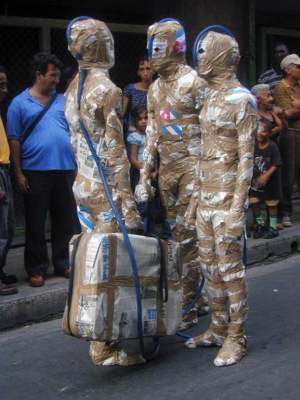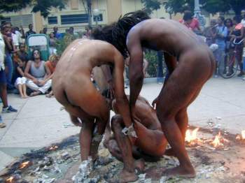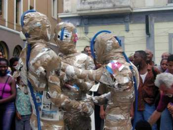 David: Okay, speaking about the performances, I could say that I loved the one we did in Santiago de Cuba, when we covered our entire bodies up with newspaper because we were prisoners of information.  We had a pipe to breathe through, but that pipe was connected to a suitcase that was also wrapped in paper; that is, we breathed information.  We went out that way and walked along Enramada Street, which is one of the main streets in Santiago.  Later we got to a park and there we ripped off all those newspapers and then walked naked among the people….