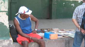 I buy them from people, though there are some that are mine. But here I don’t have that many books. You haven’t seen anything. Look over there, in front. Do you see those bundles? Over there are many more books. These here are only a sample of what I have. In a while I’m going to put out all the ones I have. Stop by a little later and you’ll really see some books.