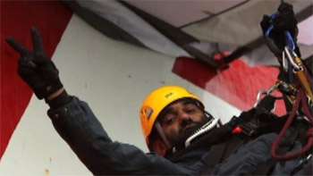 KUMI NAIDOO: Well, it looks like they’re going to drive us down pretty soon. We’re pretty much hanging on with the heavy, heavy cannon water being sprayed on us. We’re going to try and stick around as long as possible, but at this rate, I can’t say whether it will be an hour or more. But our action is peaceful. We want to draw global attention to what is the defining environmental struggle of our time, and time is running out for us to avert catastrophic climate change. And that’s why we are here.