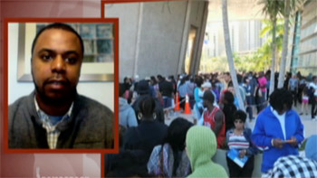 AMY GOODMAN: Over the weekend, Democrats called attention to other voting challenges by filing a lawsuit to force Florida’s Republican Governor Rick Scott to extend early voting. Last year, Scott and the Republican state legislature reduced early voting times. Now voters are seeing waits of more than six hours at the polls. Still, the 2012 election is also expected to set a record for early voting. Thirty million Americans have already cast their ballot through early voting across 34 states.