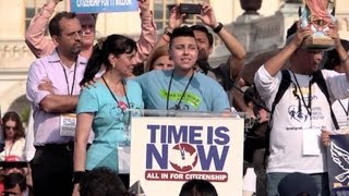 We hear from some of the voices to address the rally: 17-year-old DREAM activist Katherine Tabares of New York; NAACP President Benjamin Jealous; and Democratic Sen. Robert Menendez of New Jersey, one of the bipartisan “Gang of Eight” senators drafting a joint immigration bill.
