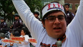 JULIO SANCHEZ: No papers, no fear! Dignity is standing here! No papers, no fear! Dignity is standing here!