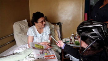 RENÉE FELTZ: So, we’re here at an apartment in the Jacob Riis House on the fifth floor. Someone has invited us to—someone has invited us in. They’re here to check on their mother. She came down from the Bronx, and the mother is bedridden. So we’re going to find out what’s happening.