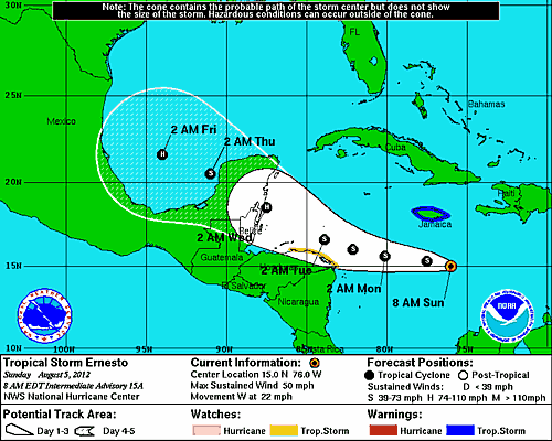 HAVANA TIMES — Tropical Storm Ernesto weakened slightly last night and is now packing 50 mph winds as it moves swiftly west heading for the Yucatan Peninsula, reported the Cuban Weather Service (INSMET) on Sunday morning.