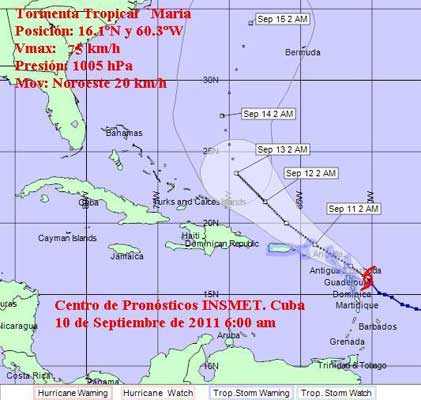 In its latest report on Saturday morning, INSMET shows a slightly weakened TS Maria moving northwest at 12 mph (20 kph) with its center located 80 miles (130 kms) east of Guadalupe in the Lesser Antilles and 405 miles (655 kms) east, southeast of San Juan, Puerto Rico.