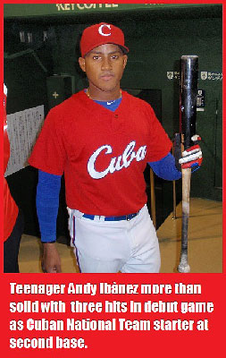 Ibáñez – getting a surprise lineup nod over heavy-hitting second sacker José Miguel Fernández – was more than merely impressive in his initial national team start, smacking three left-field singles, reaching four times, and scoring twice to key the Cuban offense.