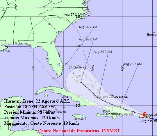 HAVANA TIMES, August 22 — Irene became the first hurricane of the season early Monday as it continues to plow through Puerto Rico. The storm is expected to take aim on the north coast of the Dominican Republic in the coming hours.