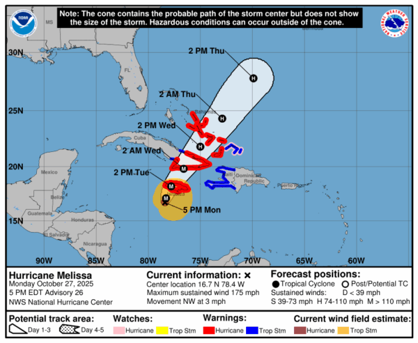 “Hurricane Melissa remains an extremely powerful and dangerous Category 5 hurricane. It is forecast to make landfall Tuesday morning in Jamaica as the strongest hurricane on record for the island. Catastrophic winds, flooding rains, and storm surge will be life-threatening. Conditions will deteriorate quickly tonight and overnight, with the storm exiting the northern coast of Jamaica later on Tuesday. A weaker, but still powerful Melissa is forecast to cross eastern Cuba late Tuesday into Wednesday morning. The southeast Bahamas and Turks and Caicos would be next, and Melissa is expected to be near Bermuda, still as a hurricane, by Thursday night.”