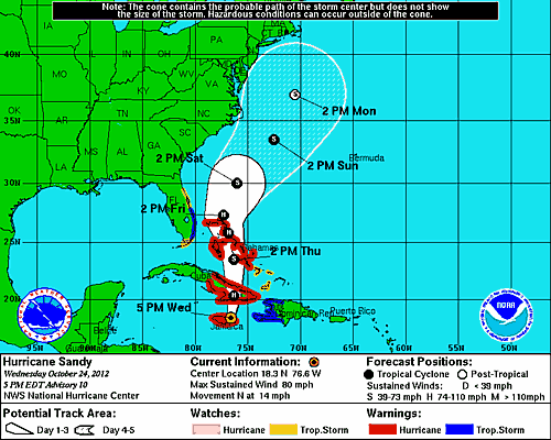 Sandy packs 80 mp/h winds and is moving north at 14 mp/h.