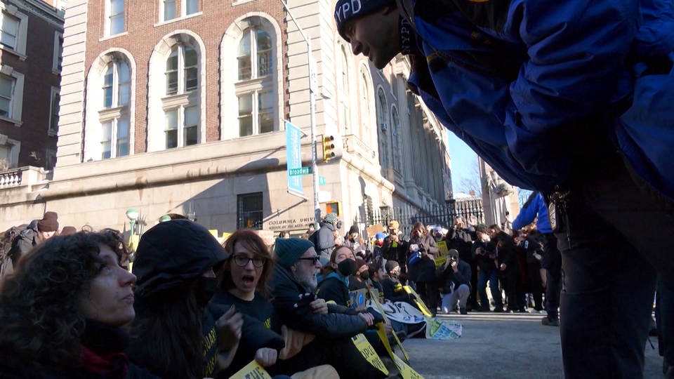 Here in New York, a dozen Columbia University students and faculty members were arrested Thursday for blocking traffic on Broadway outside campus in protest of Trump’s immigration crackdown and to demand Columbia enact stronger protections for its international students. Protesters wore matching shirts emblazoned with the words “Sanctuary Campus Now.”