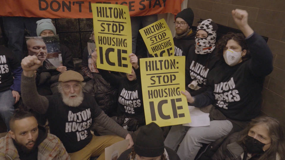 Here in New York, dozens of demonstrators were arrested in Manhattan Tuesday after they occupied the lobby of a Hilton hotel where federal immigration agents are believed to be staying. More than 100 people rushed into the hotel, chanting anti-ICE slogans. New York City Mayor Zohran Mamdani praised the protesters. In a statement, Mamdani’s spokesperson said, ”ICE is a rogue agency that has repeatedly carried out cruel, inhumane and lawless raids and arrests of American citizens.” Democracy Now! was at the protest.