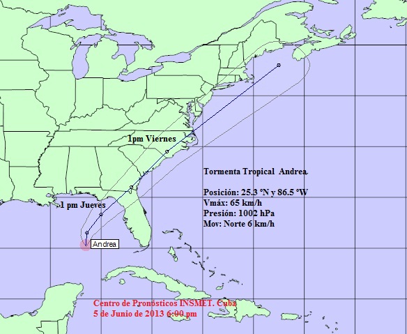 At 6:00 p.m. Cuban time (EST) the Cuban Weather Service (INSMET) located the center of Tropical Storm Andrea, the first of the current hurricane season, at 500 kilometers (310 miles) southwest of Tampa and 510 kilometers south-southwest of Apalachicola, both in Florida.