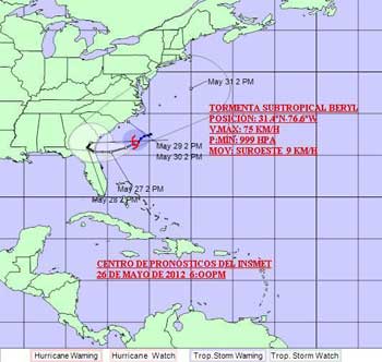 HAVANA TIMES — Sub-tropical storm Beryl, the second tropical cyclone of the current season in the Atlantic, is currently east of Georgia and some 215 miles southeast of Charleston, South Carolina.