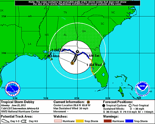 Debby currently packs 50 mph winds and has a central pressure of 993 millibars. It is virtually stationary on Monday morning.