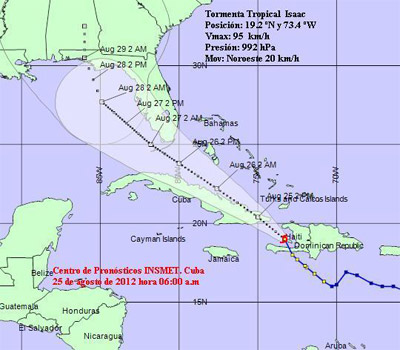 INSMET warns of the threat posed by TS Isaac to Cuba and recommends that the population remain attentive to orientations of the Cuban Civil Defense Authorities who are taking precautions to save lives and economic interests throughout the eastern and central provinces expected to be affected by Isaac.
