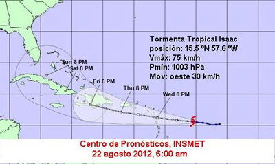 HAVANA TIMES — Tropical Storm Isaac should enter the eastern Caribbean late Wednesday or early Thursday on a track that could pose a threat to Puerto Rico, Haiti, the Dominican Republic and Cuba.