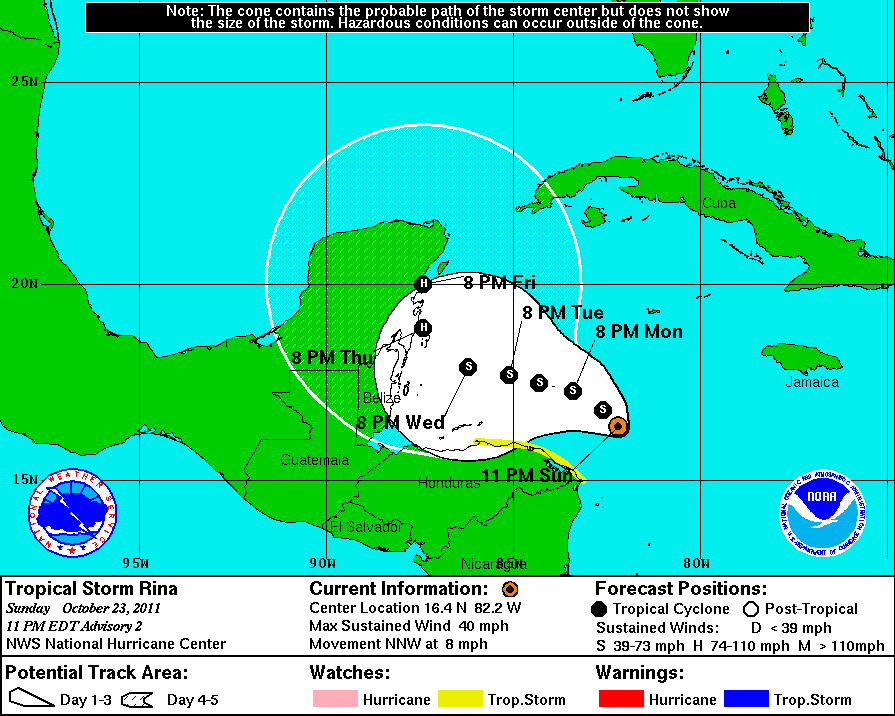 The National Hurricane Center (NHC) in Miami is predicting that TS Rina will gain hurricane strength (74 mph) before a possible landing on the Mexican Yucatan peninsula by Thursday or Friday.
