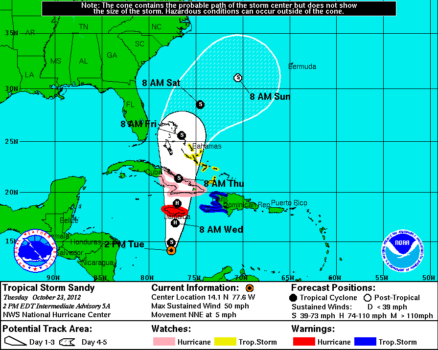 By noon today Cuba’s Weather Forecast Center (INSMET) said Sandy has 50 mp/h winds and is moving at 4 mp/h (7 kp/h) in a north/northwest direction.
