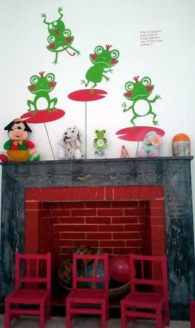 Posted on one of the walls of the nursery, we see a decorative hanging which alludes to the Grimm Brother’s The Frog Prince. A text, in English, explains that, before finding the right frog (which turns into a prince on being touched by true love’s kiss), one must first kiss many frogs.