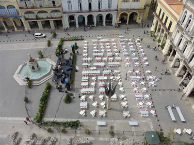 But the place that transformed the most was undoubtedly Plaza Vieja, with more than half of it closed off and filled with tables with white table clothes and red bows. For the “modest” price of 33 USD per person (about twice the average monthly wage here), people could dine there last night and enjoy a concert with Ivette Cepeda.