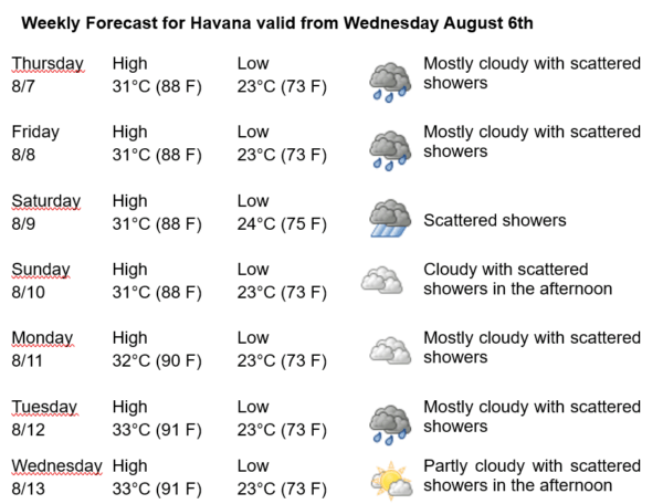 The forecast for the coming days in Havana is for partly cloudy mornings, with occasional clouds along the northern coast. By late morning, it will be partly cloudy, becoming more overcast in the afternoon with some showers, rain, and thunderstorms, mainly in inland and southern areas.