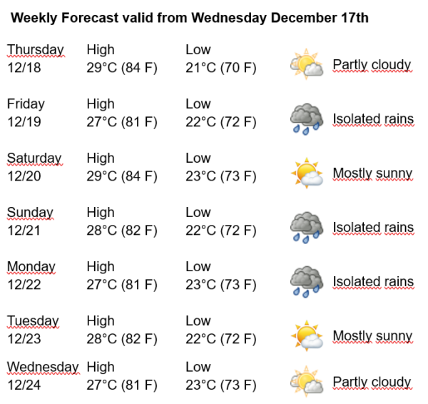 For the coming days, low clouds will continue to move into areas along the north coast of the capital, with intermittent showers and rain, which will extend to inland areas in the afternoon. Winds will be mainly from the northeast, with speeds between 15 and 30 kilometers per hour, with higher gusts. Relative humidity will range from 45% to 60%. High temperatures will be between 27 and 29ºC (81 and 84 F) and lows between 21 and 23ºC (70 and 73 F). The sea surface temperature will be 28ºC (82 F).