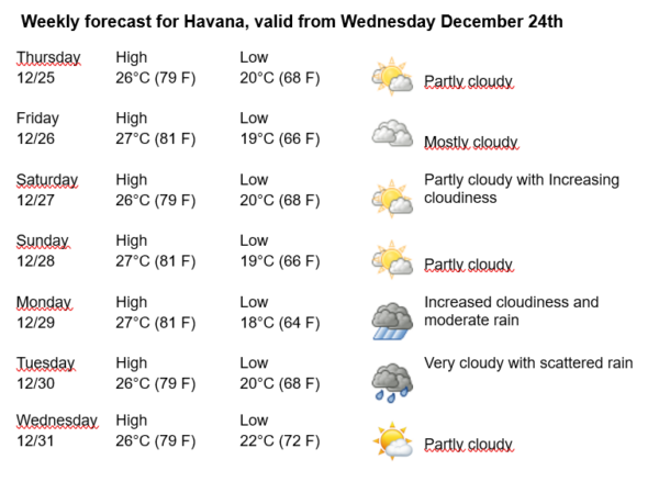 HAVANA TIMES – A robust high-pressure system over the western Atlantic, east of Florida and the Bahamas, continues to dominate the region, imposing northeasterly to easterly winds. However, the direct influence and reinforcement of an active frontal system will begin to be felt in Havana starting on Monday.
