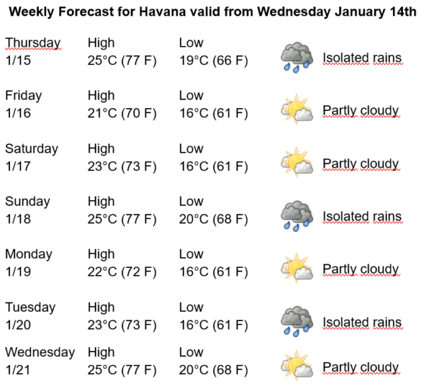 HAVANA TIMES – Over the past 24 hours, the weather in Havana has been dominated by migratory high pressures. This system brings weak winds from the first quadrant, favoring the transport of clouds towards coastal areas of the capital with isolated showers. These showers were also intensified by the proximity of a nearly stationary front, but the accumulated rainfall is not significant.