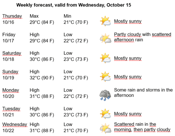 Winds will blow from the northeast to east at speeds between 10 and 25 kilometers per hour. Relative humidity will range between 75% and 95%. Highs will be between 29 and 32°C (84 and 90°F) and lows between 21 and 23°C (70 and 73°F). Sea surface temperature will be 28°C (82°F).
